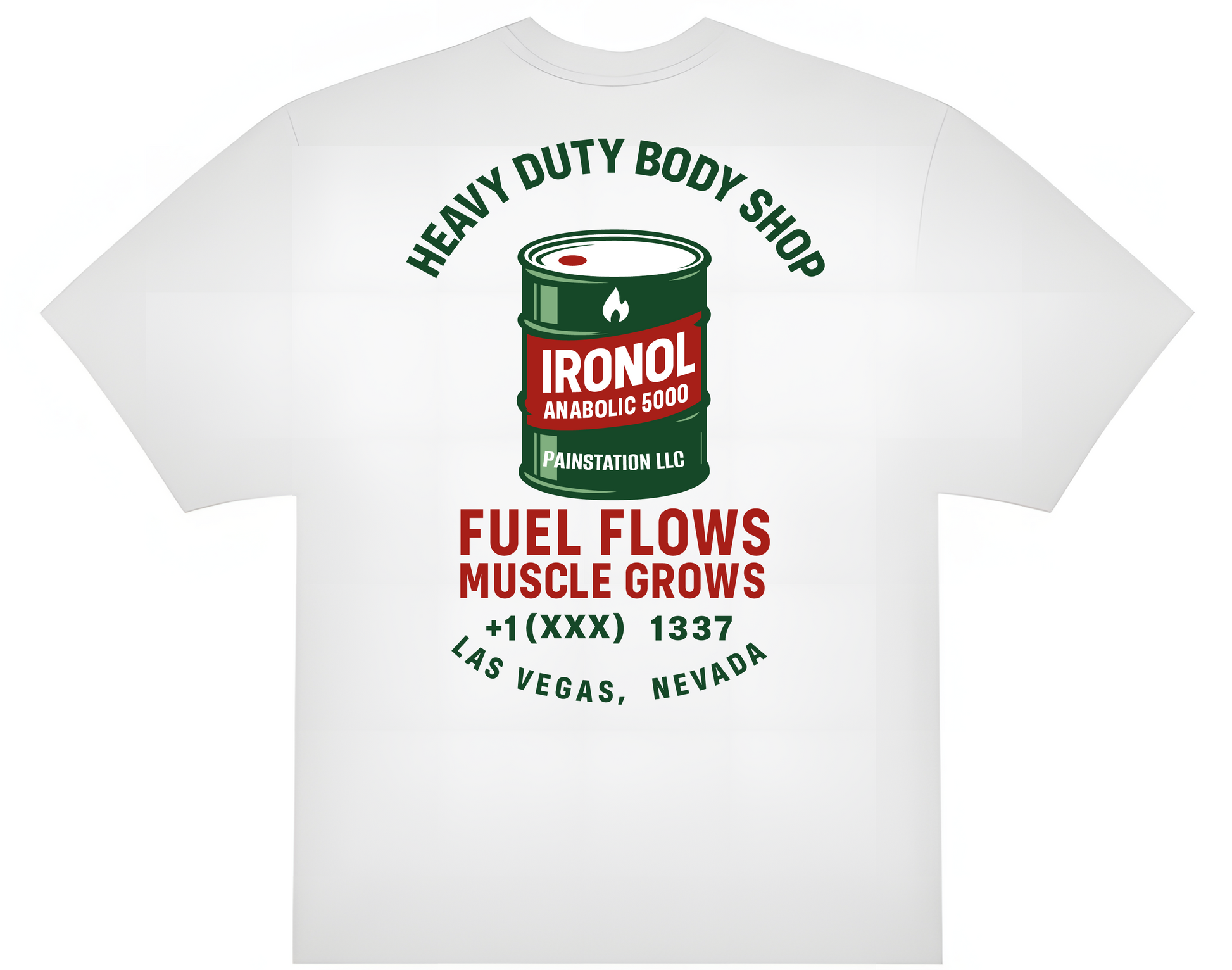 Rückseite: Ironol-Fass in Grün mit „Heavy Duty Body Shop“-Statement