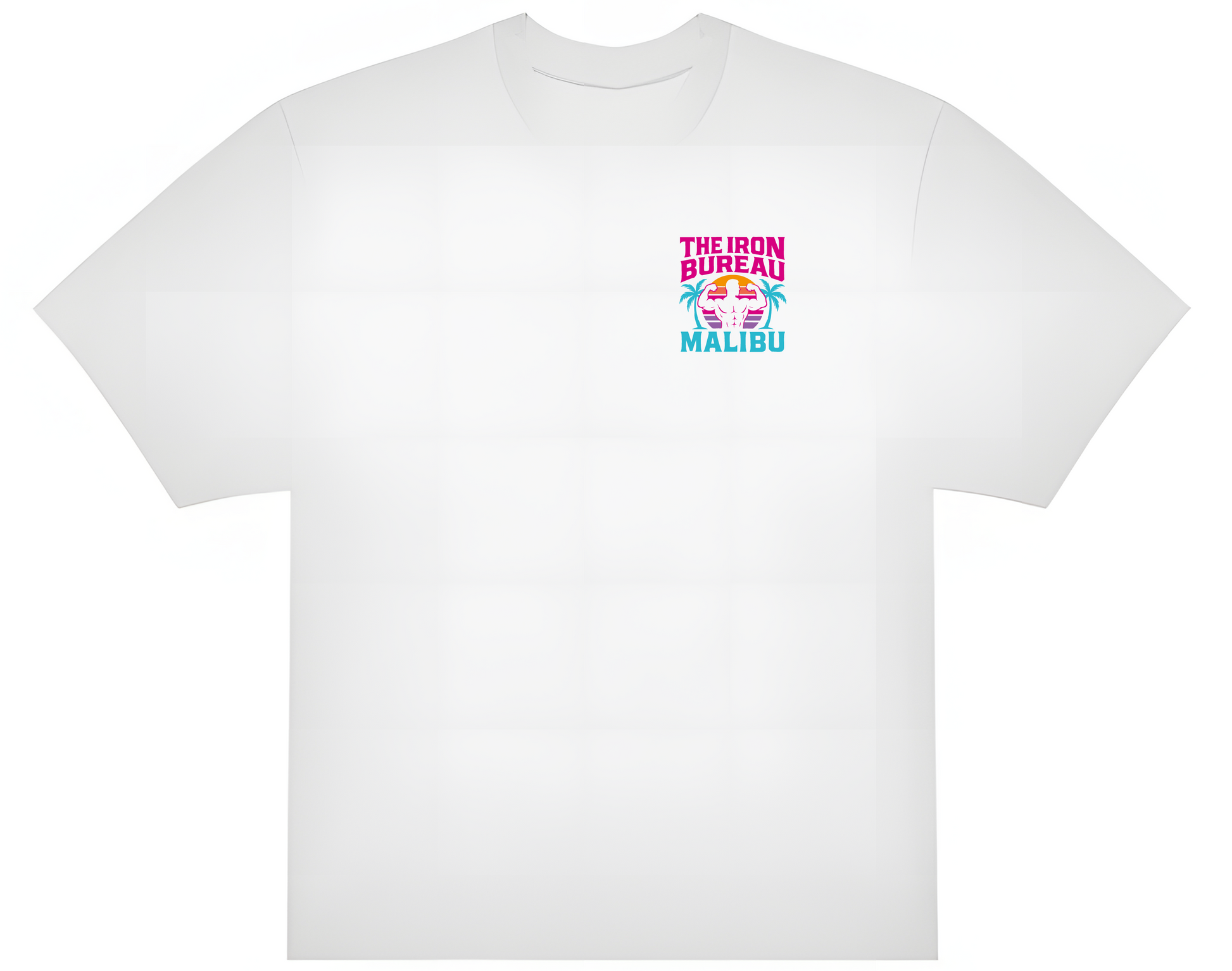 Frontprint: Dezentes Brustlogo mit Palmen, Sonnenuntergang und ikonischem Iron Bureau-Schriftzug.